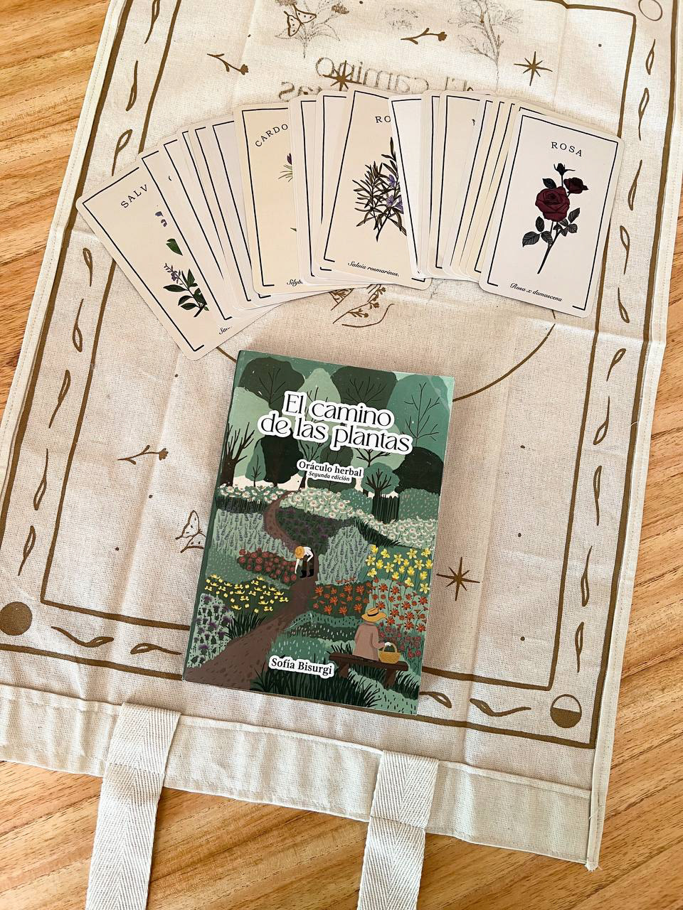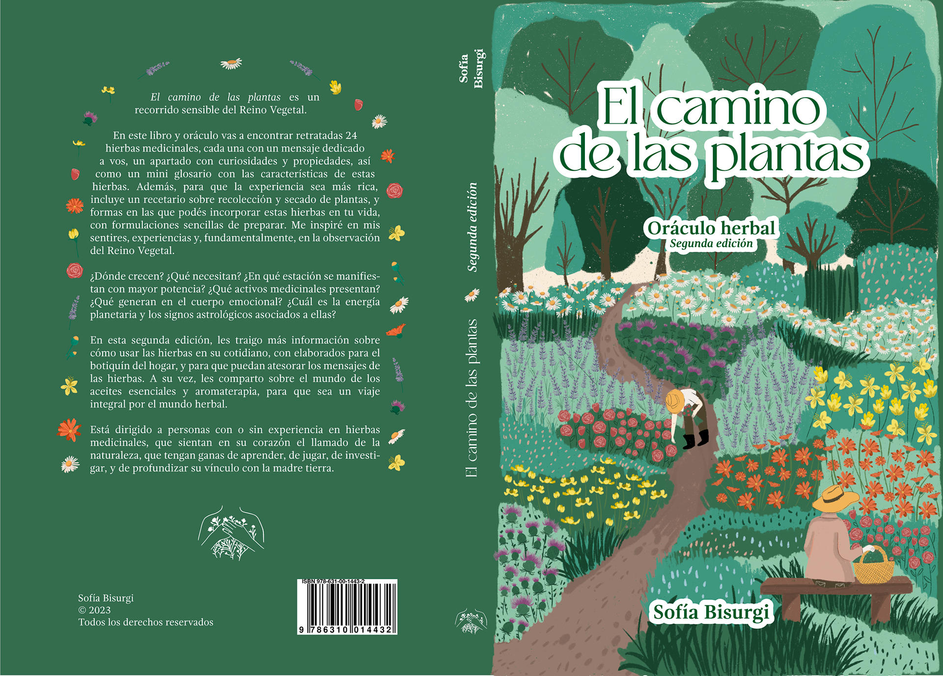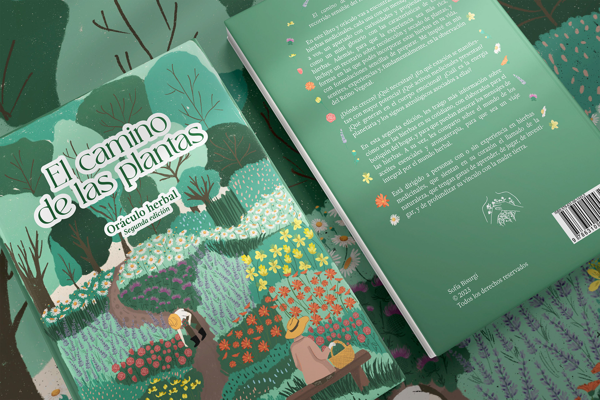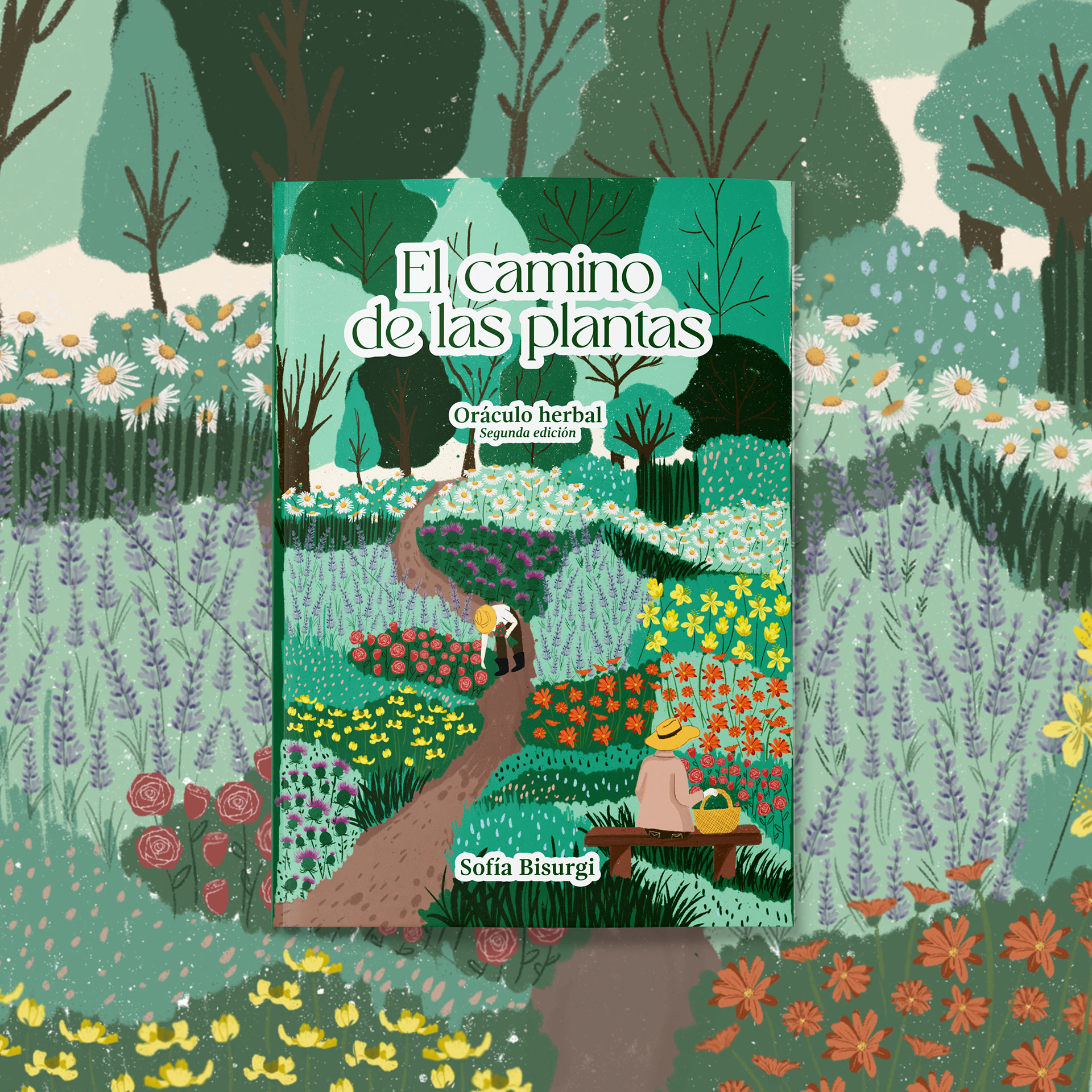 Cover illustration for the second edition of Sofía Bisurgi's book. This book accompanies an herbal oracle of cards from different medicinal plants.The idea for the cover is based on the concept that plants return to us through the hands that collect them and their medicinal use.The illustration had to have the path as its central axis and the most important medicinal flowers such as milk thistle, lavender, rose, chamomile, calendula, jarilla and rue.