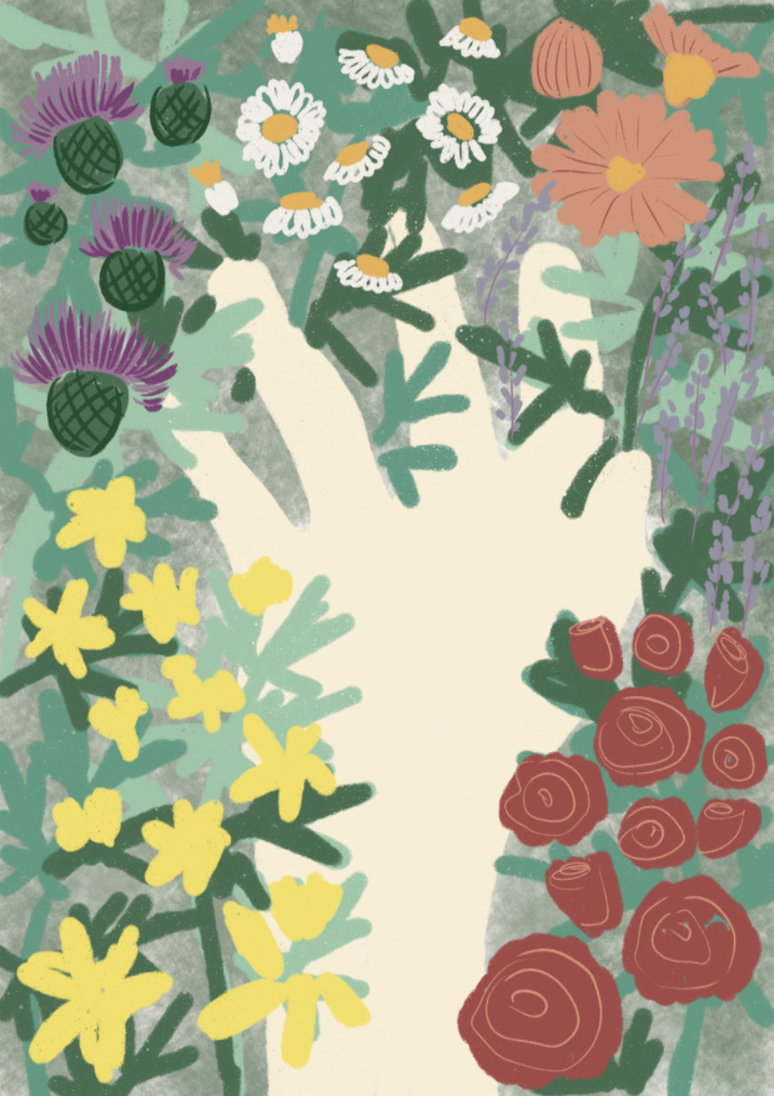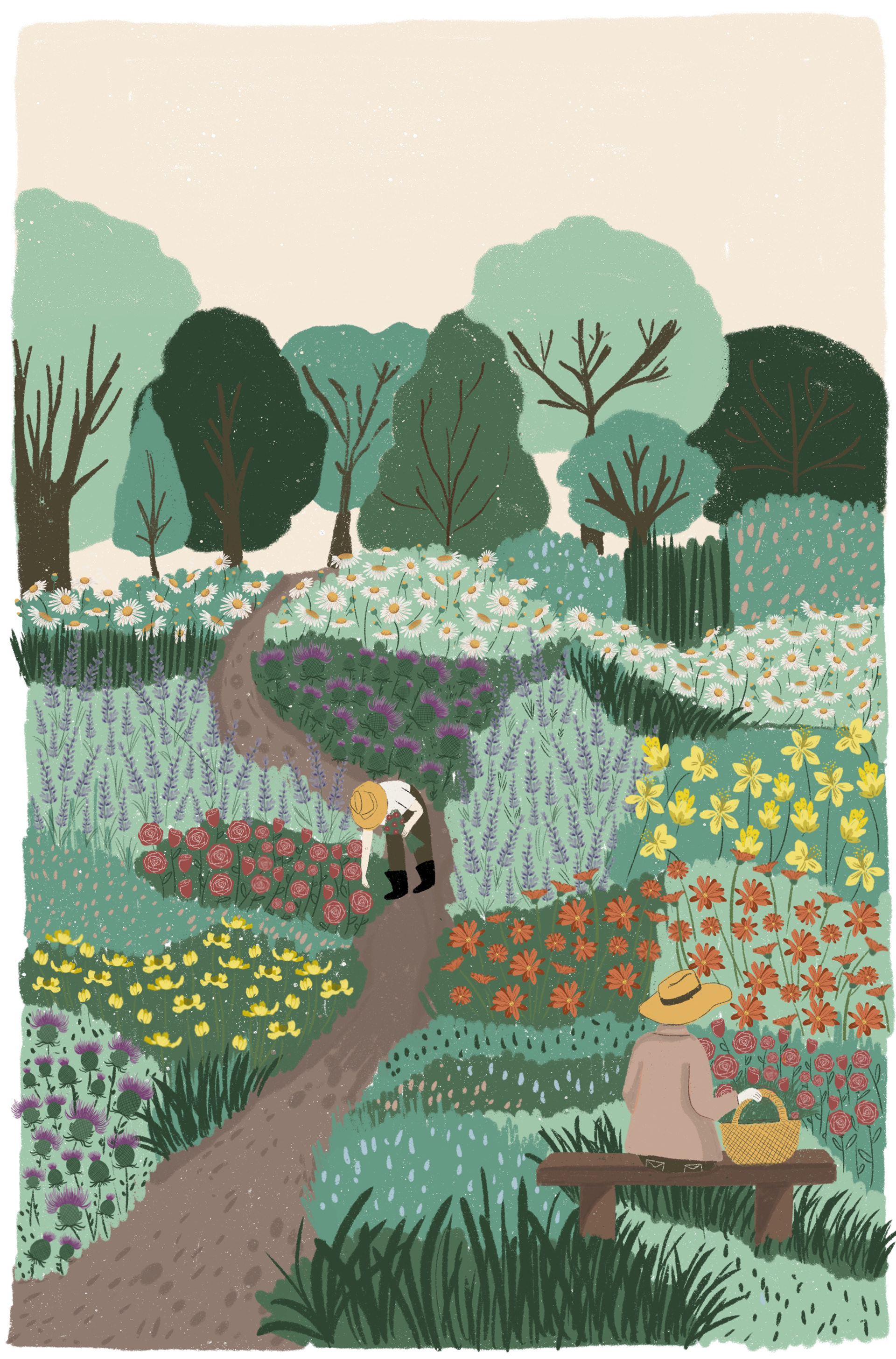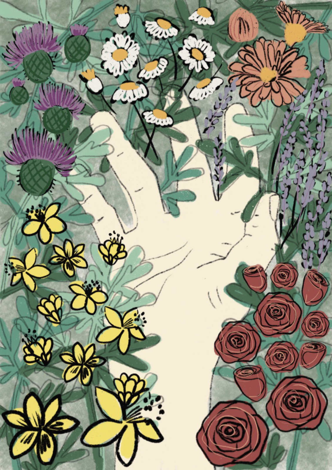 Cover illustration for the second edition of Sofía Bisurgi's book. This book accompanies an herbal oracle of cards from different medicinal plants.The idea for the cover is based on the concept that plants return to us through the hands that collect them and their medicinal use.The illustration had to have the path as its central axis and the most important medicinal flowers such as milk thistle, lavender, rose, chamomile, calendula, jarilla and rue.