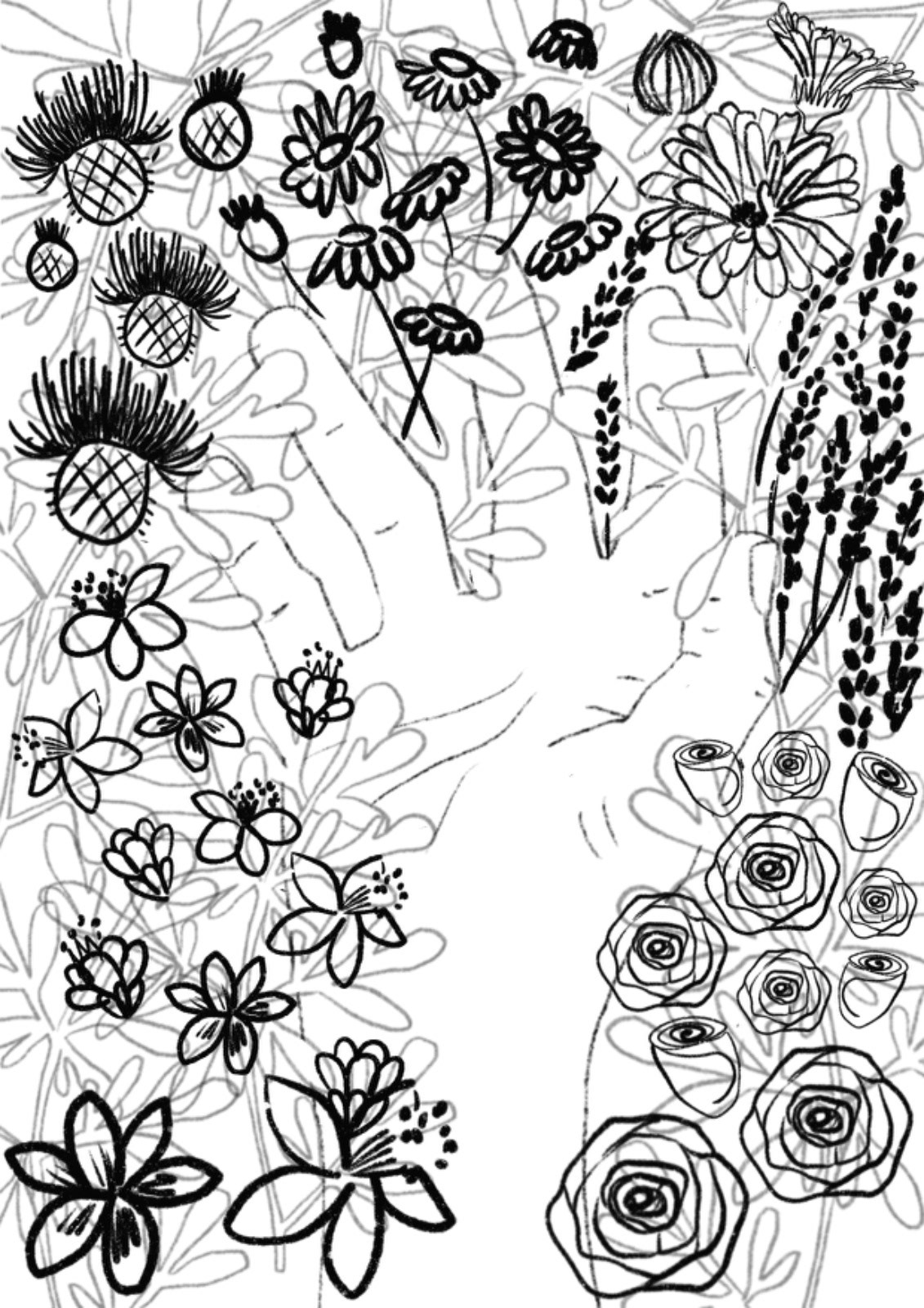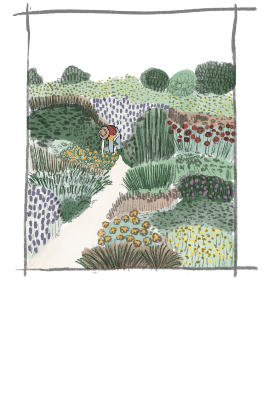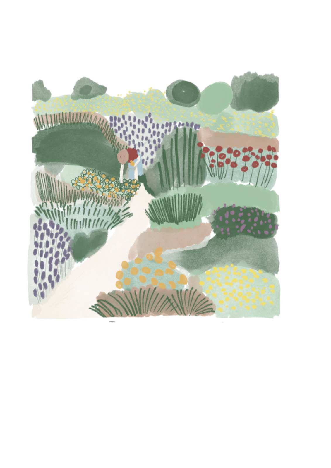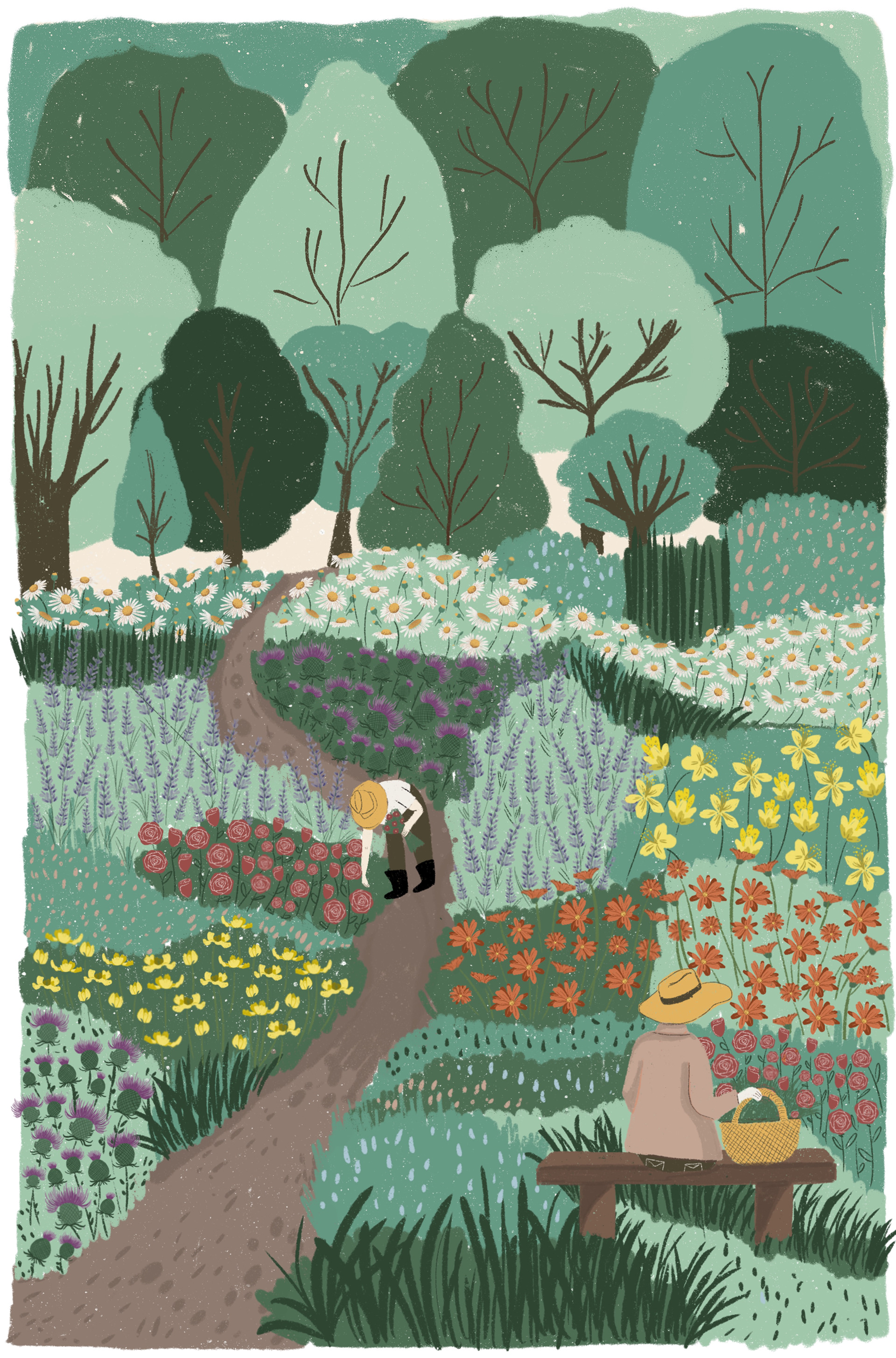 Cover illustration for the second edition of Sofía Bisurgi's book. This book accompanies an herbal oracle of cards from different medicinal plants.The idea for the cover is based on the concept that plants return to us through the hands that collect them and their medicinal use.The illustration had to have the path as its central axis and the most important medicinal flowers such as milk thistle, lavender, rose, chamomile, calendula, jarilla and rue.